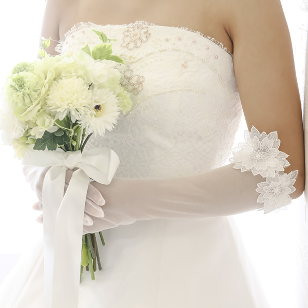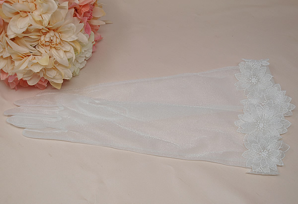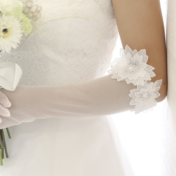 肘下丈のストレッチオーガンジーグローブにキュートなフラワーのレースをほどこしました。