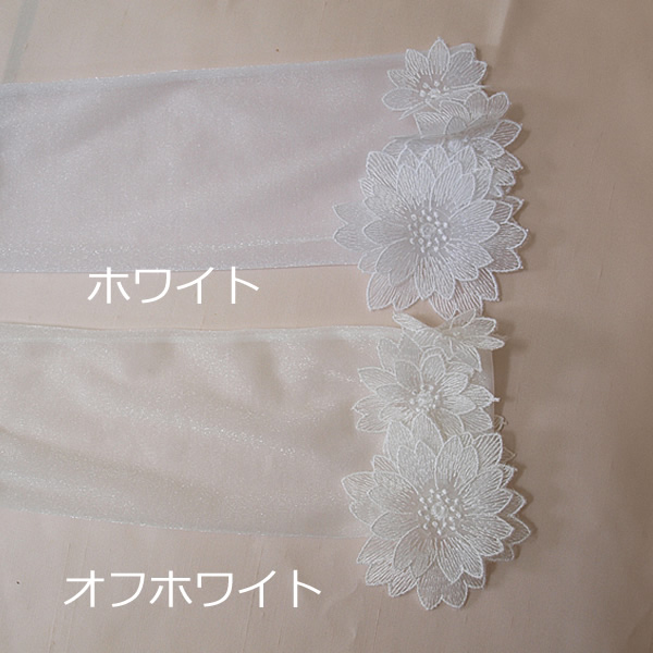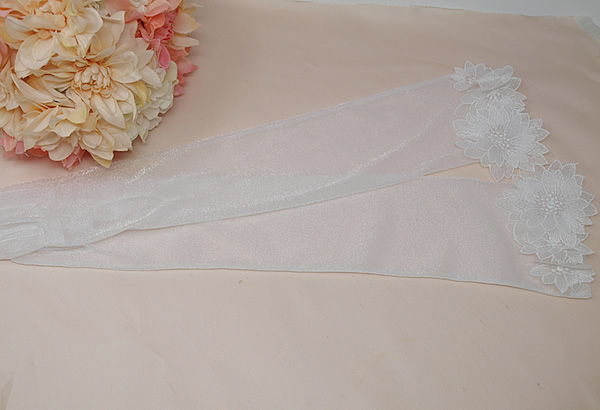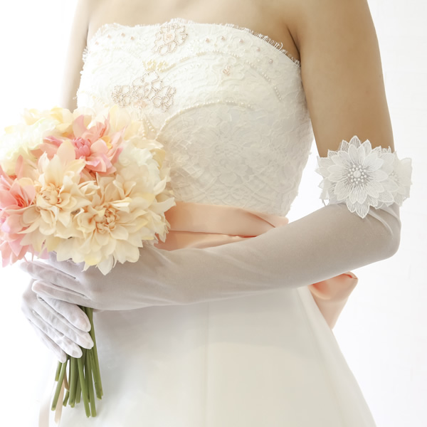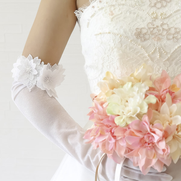 肘上丈のストレッチオーガンジーグローブにキュートなフラワーのレースをほどこしました。