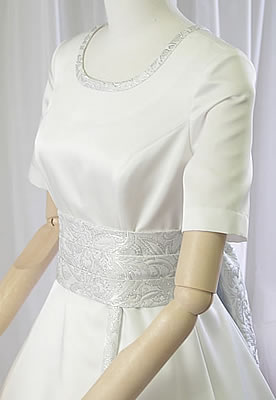 衿のラインは大きく開けず、お袖が付きのお肌をあまり見せたくない方の為の シンプルなドレス縁取りに使った、シルバーのジャガード地は和風っぽく、