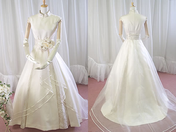 肌の露出を抑えたハイネックの落ち着いたシルエットのウエディングドレスです