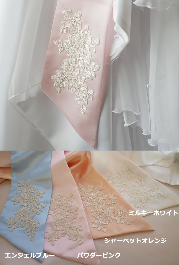 リボン端には上品なシルバー糸のレース刺しゅうを施しました。