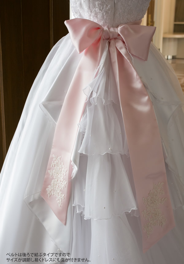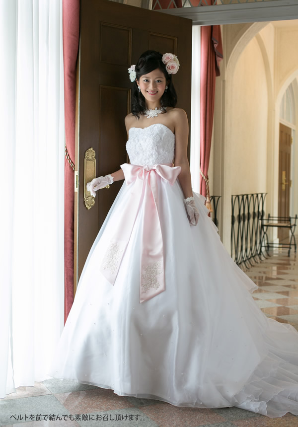 リボンを前で結ぶと白ドレスがキュートなカラードレスのような印象に。