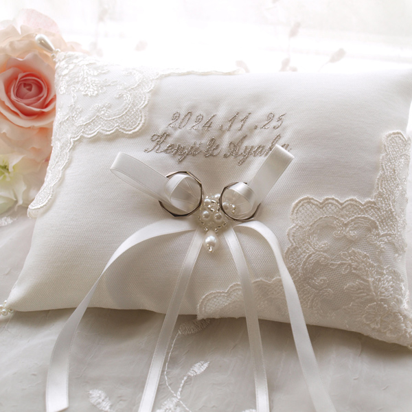 光沢の美しいミカドサテンに上質なレースをあしらったリングピロー。
