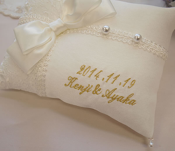 ゴールドで記念日とお二人のお名前を刺繍いたします。