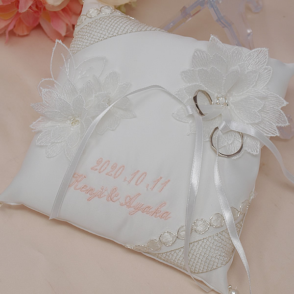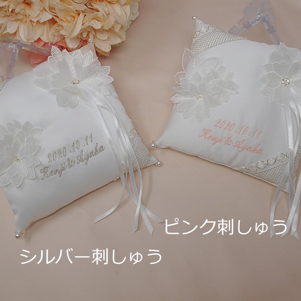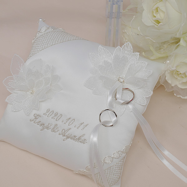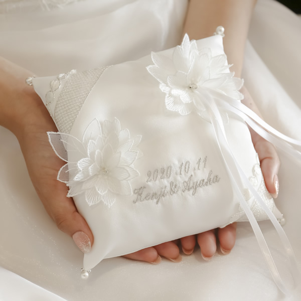 お花のモチーフをあしらったキュートで上品なリングピロー。シルバーのレース使いで爽やかなイメージに。