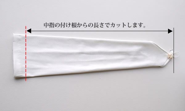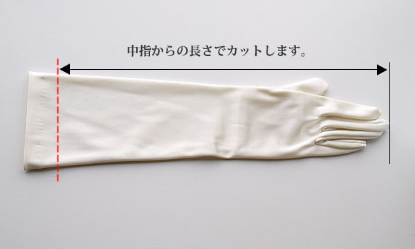フィンガーレスタイプの場合は中指の付け根からの長さをお測り下さい。平置きの状態で指定された長さにカットします。