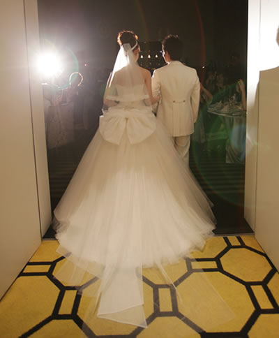 披露宴ではベールの位置を低めにし、挙式に引き続き付けさせていただきました。