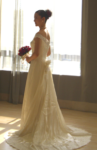 長くなりましたが、本当はもっと早々にお礼とご報告をすべきでしたが、なにぶん、かのような状態でしたので、なかなか時間をとることができませんでした。本当にすっかりご無沙汰してしまいまして申し訳ございませんでした。それでも時々、てく・まりんぼ様のHPを拝見し、あれからもどんどん日本中の花嫁さんが 皆様のドレスを心待ちにしている様子を見知り、とても嬉しく思っております。 私も、いろんな大変なことがあり、本当に心身ともに乗り越えられるかどうか不安な最中、この素晴らしいドレスには、どれほど救われたことでしょうか。この ドレスとともに、自分の人生で一番大事な、そして一番輝かしい1日を無事に過ごせたことは、一生、心に残ります。そして、そのような大切な思い出を作ることに、ご協力いただきました、てく・まりんぼの皆様の温かいお心には、今もって、感謝の気持ちでいっぱいです。本当に、ありがとうございました。そしてこれからも、日本中、そして世界中の花嫁さんに幸せをもたらしてくださいますこと、お祈りいたしております。