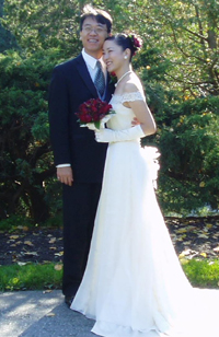 そして当日は、晩秋のトロントは普通、大変寒く、日本の12月上旬の気候なのですが、不思議な ことに、雲ひとつない晴天に恵まれ、朝、ドレスを身に着けた瞬間に、ドレスが体にピッタリと沿うだけでなく、ドレスの着心地がとってもすばらしく、「今日一日、すばらしい日になる!」 と語ってくれるかのように、気分も上昇、一瞬にして幸せな気持ちに浸ることができました。そして朝の9時から夜8時まで、11時間も、ウェディング・ドレスを着通しました!