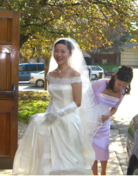 挙式が14:30に終了したら、そのまま庭園(日本でいう国立公園のような所)へドライブし、そこで 記念写真などを取ったのですが、そのとき、さすがはトロント、というようなすばらしい紅葉があり、そこで記念写真をとりました。 そのときの写真を郵送いたしますので、どうぞ、ご覧くださいませ。そのときも、長い公園の道のりをドレスのまま歩いたのですが、観光に来ている、一般の方 々からもドレスを褒められ、祝福してもらい、本当に至福のときを過ごすことができました。