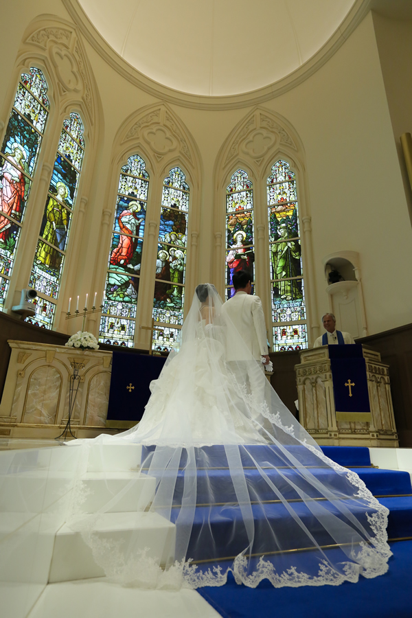 挙式でのベールが広がった後ろ姿は、圧巻の美しさだったと
