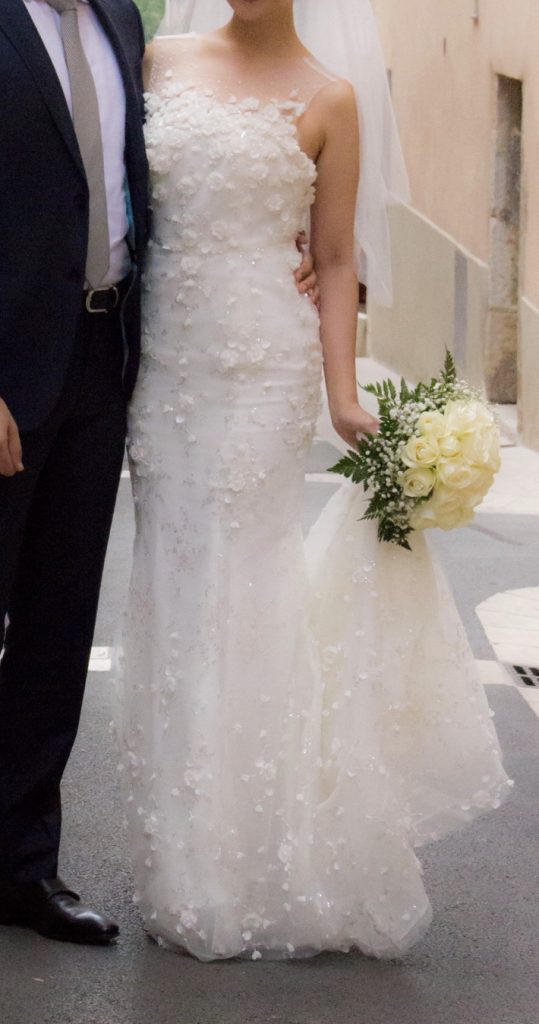 もう1枚はW.N様ご本人のウェディングドレスです。チュール生地ベースに可愛らしいお花が全体に散らされているマーメイドドレスです。