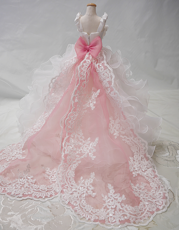 特に後ろから見た時の、ピンクのリボントレーンの感じが本当に結婚式で着た時のようで感激しました。(折角なのでもっとトレーンが映えるように飾ろうかな、と今凄くわくわくしながら考えています。)