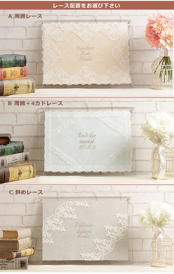 額:アクリル製 置き又は壁掛け仕様 内部:お手持ちのベールのチュール、レース部分を使用 紙
