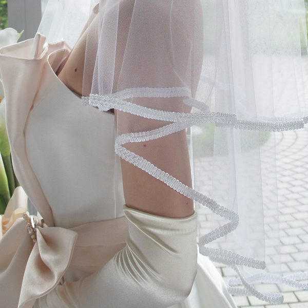 美しく編み込まれた模様のブレードをベール周囲にほどこしました。