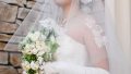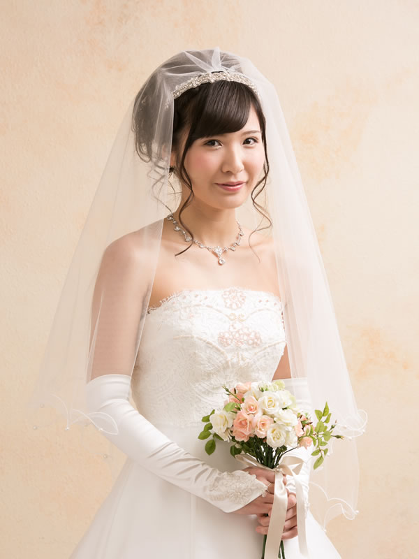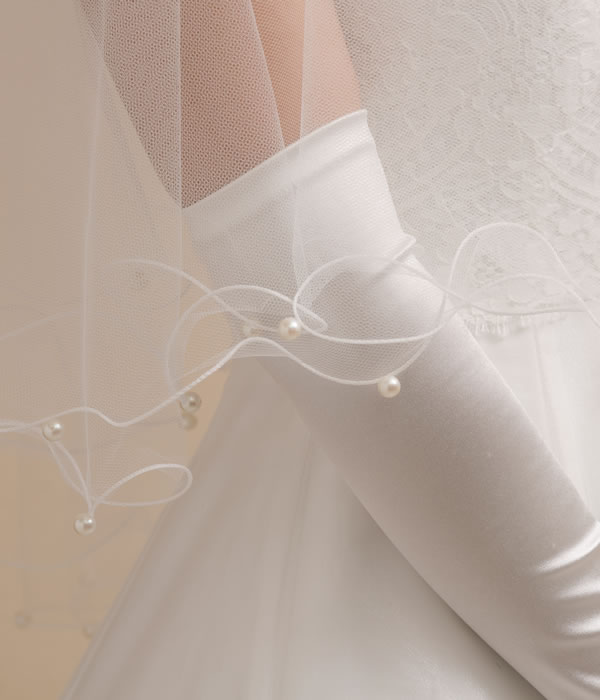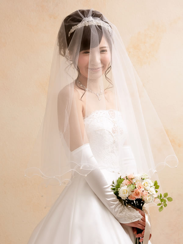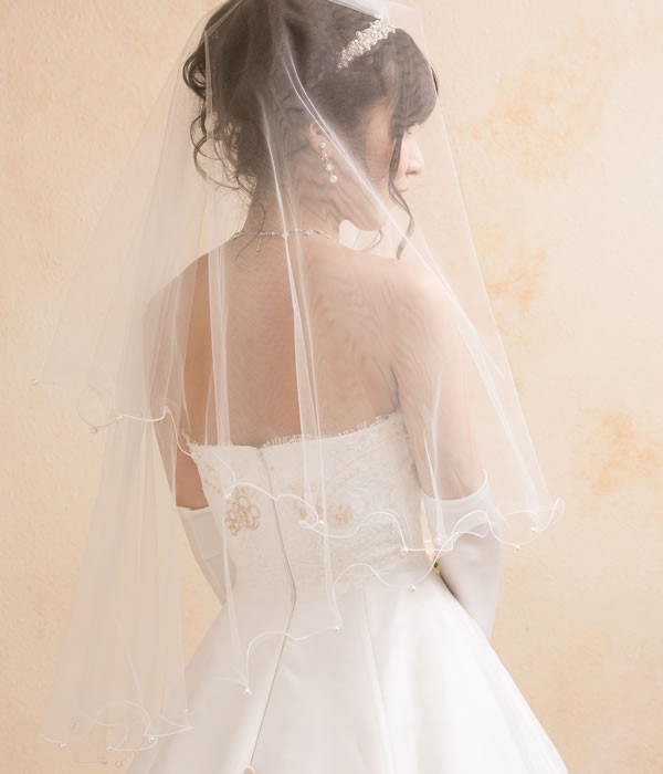 ふわふわと軽やかな動きのあるベールの端に大粒のパールをほどこすことで、ベール端のラインがはっきりとした華やかなベールです。