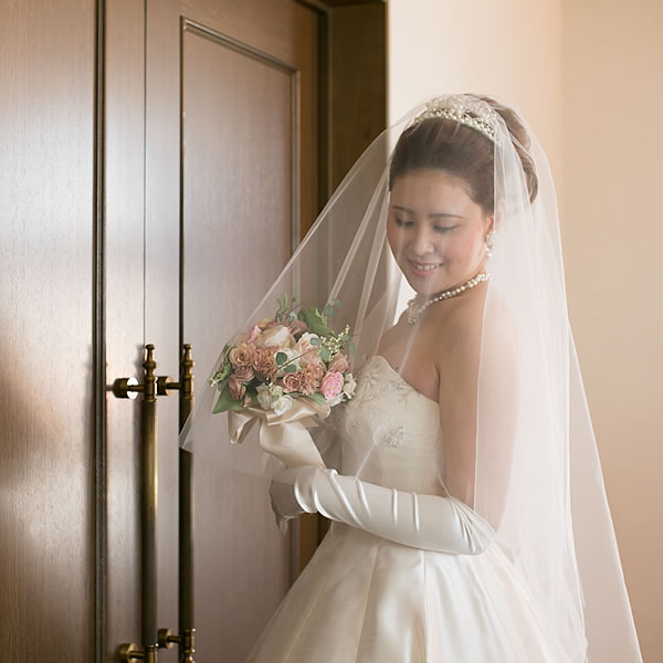 チュール素材全体に上品なシルバーラメを施したベールは、花嫁様の動きによってキラキラと光り、とてもエレガントに演出します。