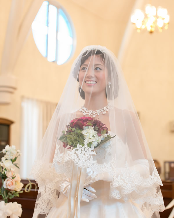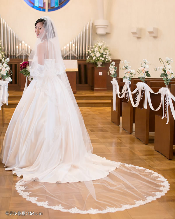 憧れのロングベールで後姿も極上の花嫁様を演出。