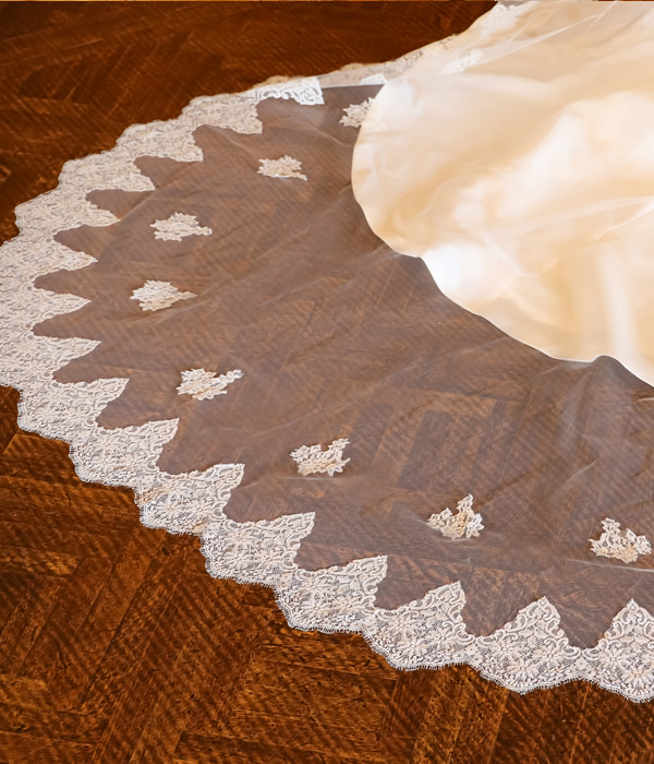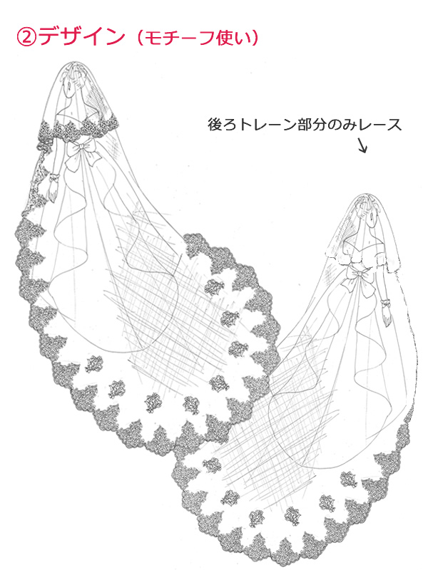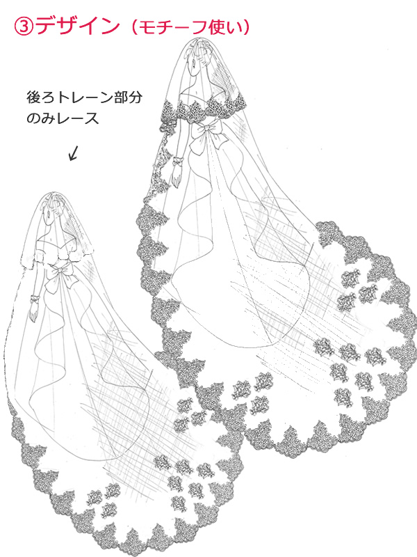 幅広レースにモチーフを散らしました。ドレスの裾からベールのレースへと続く華やかな後ろ姿に。フロント部分はシンプルに、後ろトレーン(後裾)のみのレースでも承ります。
