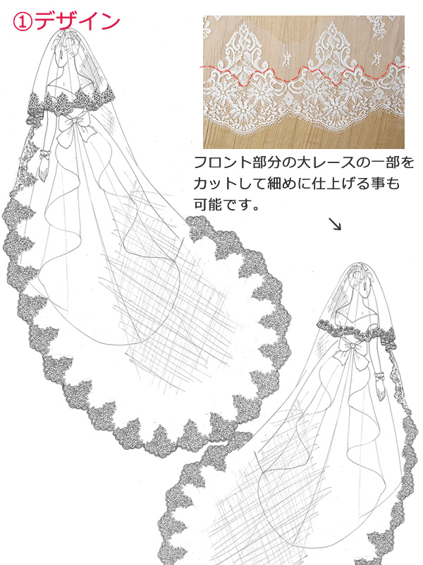 レースを1周ぐるりと施したデザイン。幅広のレースがエレガントで印象的な後ろ姿を演出します。フロント部分が重くならないよう太レースの一部をカットして細めに仕上げる事も出来ます。(②、③デザインでも対応できます)