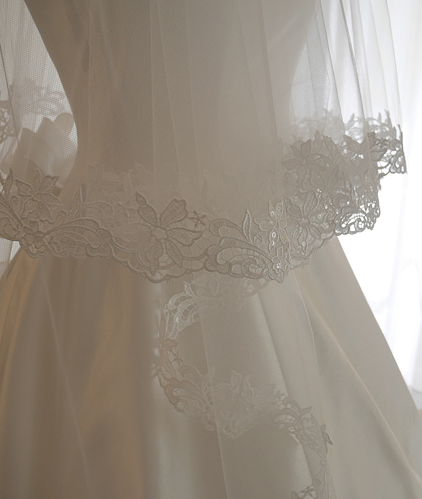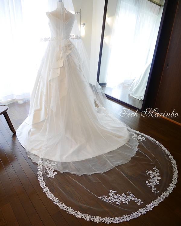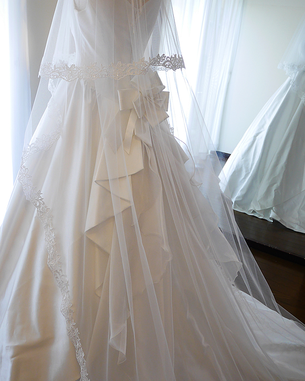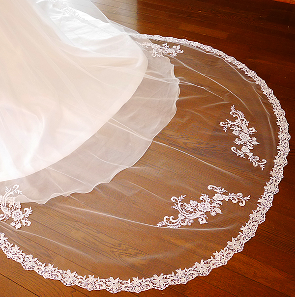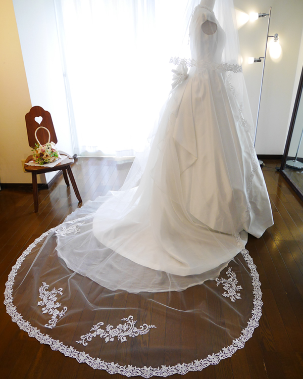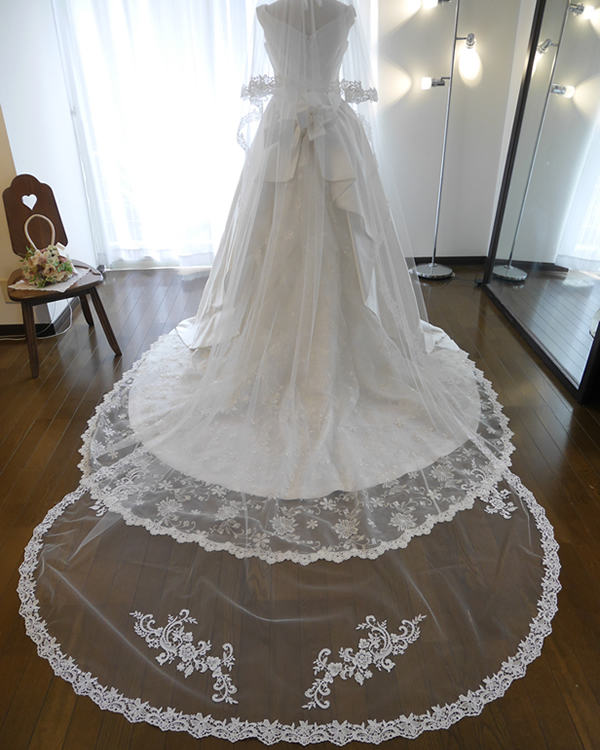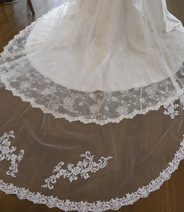 シンプルなドレスはもちろん、トレーンが華やかなドレスにも合うロングベールです。