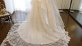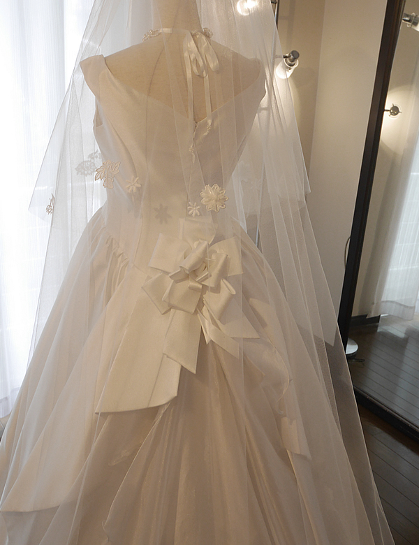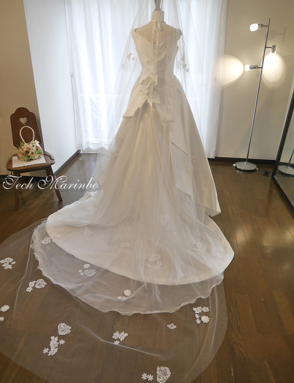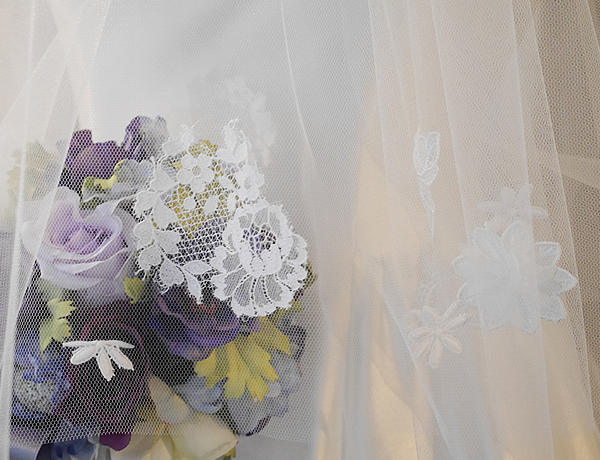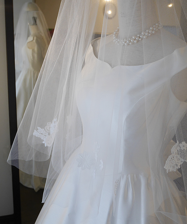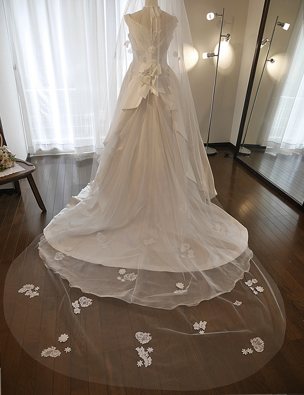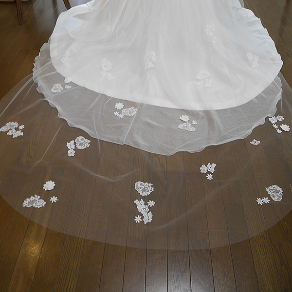 小さないくつもの種類のレースを散りばめた少し甘いイメージのロングベールです。