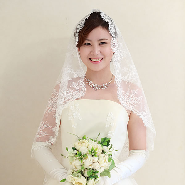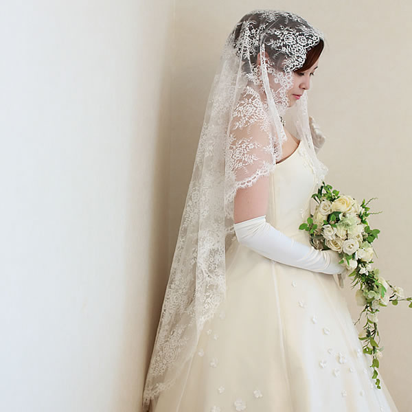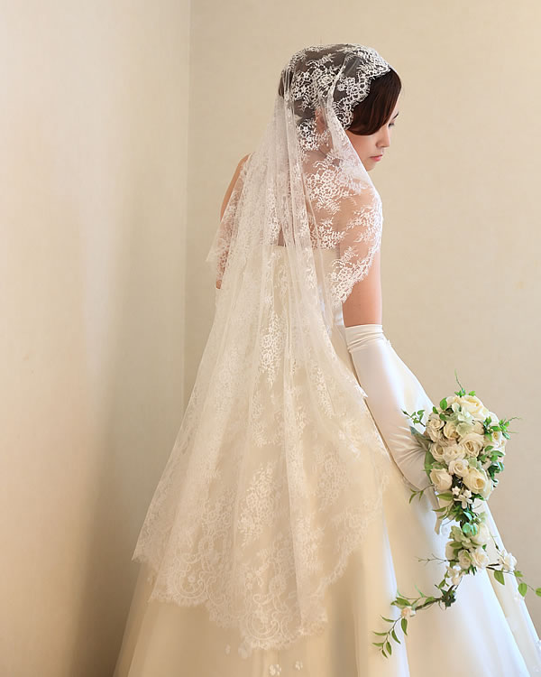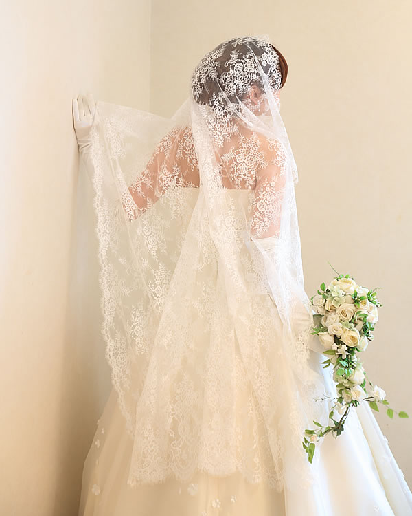 リバーレースが織りなすゴージャスな柄でお顔周りと裾を華やかに演出します。