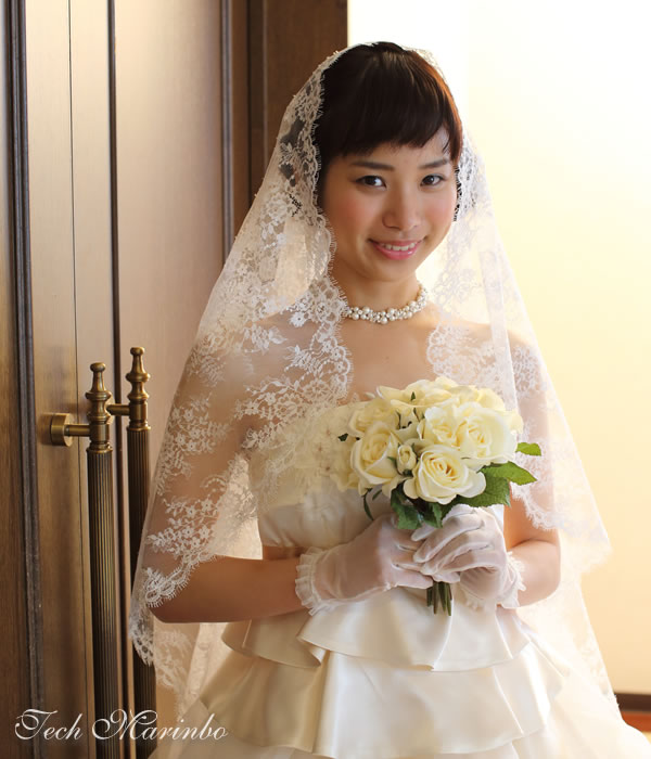 リバーレースが織りなすゴージャスな柄でお顔周りと裾を華やかに演出します。