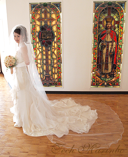 細い透明ワイヤーをベールの周囲に通しながら加工したロングベールです。