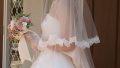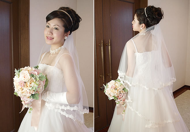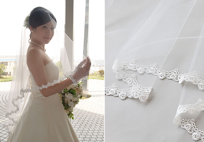 光沢と立体感のあるレースが細幅ながらも印象的なウェディングベールです。