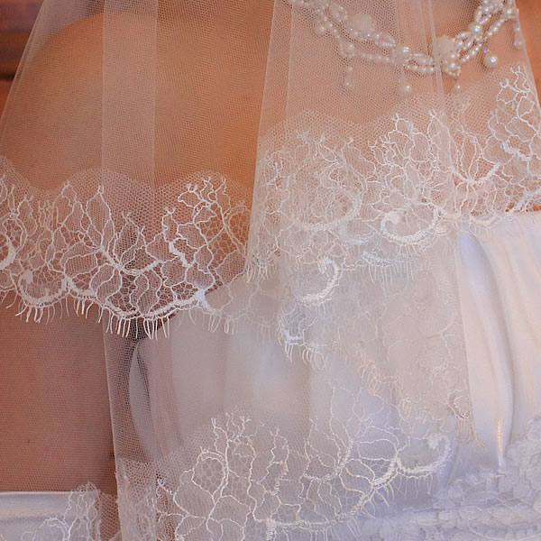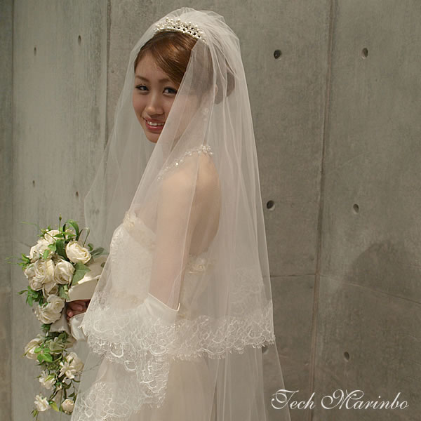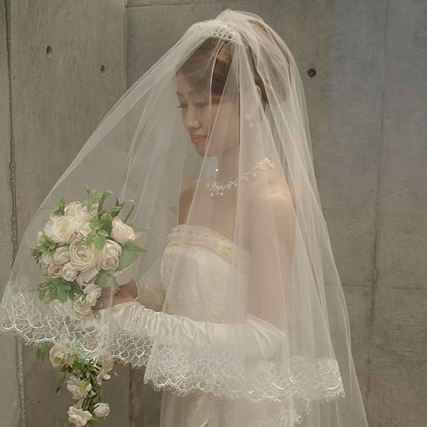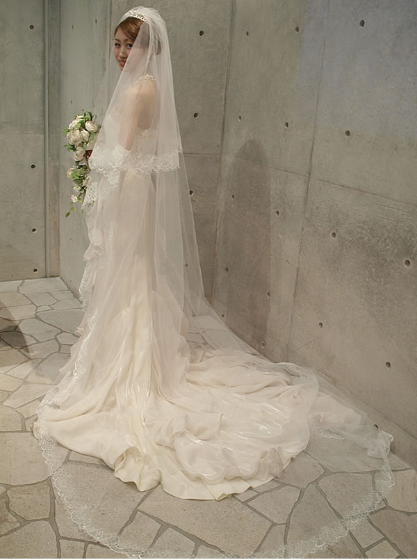 繊細で柔らかなリバーレースをほどこしたウェディングベール。エレガントでありながら軽やかなレース刺繍がノーブルな表情を引き立てます。