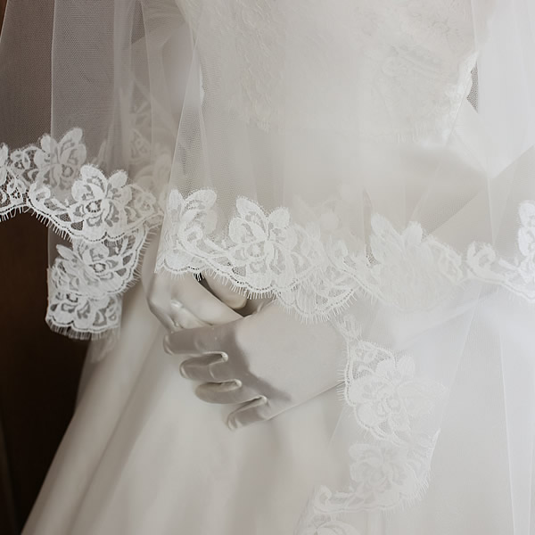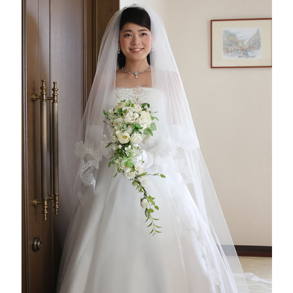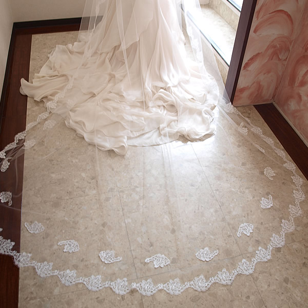 フランス製リバーレースのロング丈ベール。後トレーン部分は花柄のフェミニンなリバーレースをあしらいました。大人可愛いロングベールです。