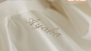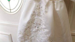 上質なブライダルサテンの上に光沢のあるケミカルレースをほどこしました。