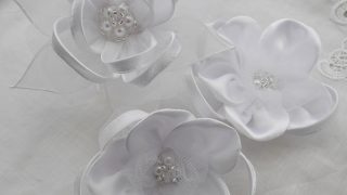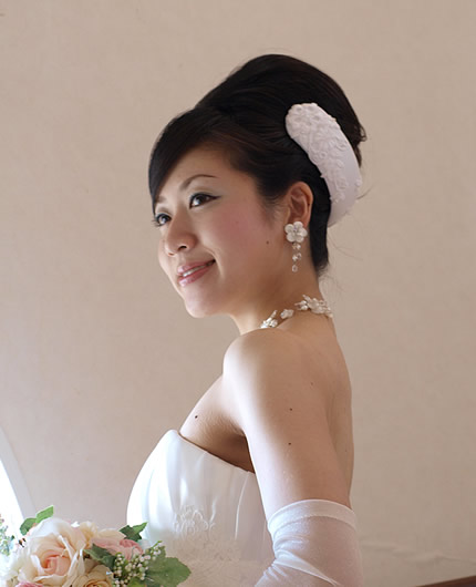 細めの5cm仕上げのボンネは合わせやすく、ヘッドの中心やサイドにもアレンジしていただけます。。