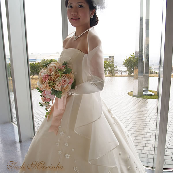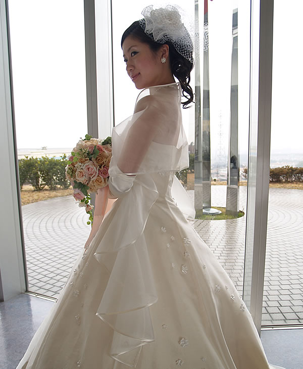 サテンのパイピングを周囲にほどこすことで、流れるようなフリルラインを表現しました。ウエディングドレスに映えて、色々なアレンジが楽しめます。
