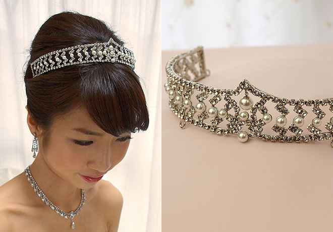 ラインストーンとパールがゴージャスにアレンジされたエレガントなティアラ。存在感ある太幅のデザインは、まさにロイヤルな花嫁を演出してくれます。