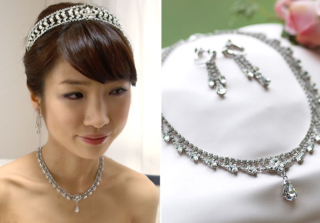 ネックレス&イヤリングは気品あふれる輝きが美しいスタイリッシュな組み合わせ。すっきりとしたラインは、お顔周りが美しく際立ちます。華やかで洗練されたドレス姿を演出してくれるゴージャスなブライダルアクセサリーです。