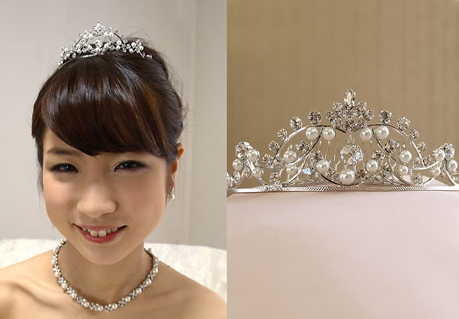 パールとダイヤの繊細な組み合わせが美しい洗練されたティアラです。動くたびに中央のダイヤが揺れピュアな輝きを放ちます。