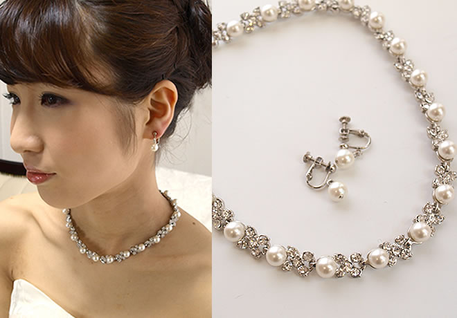 ネックレス&イヤリングもパールとダイヤの上品なデザインを組み合わせました。