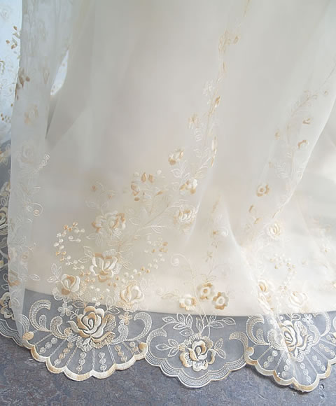 アイボリーの温かさと上品なレースの優しさが癒しを与えてくれる、ふんわりシルエットのエンパイアウェディングドレス。